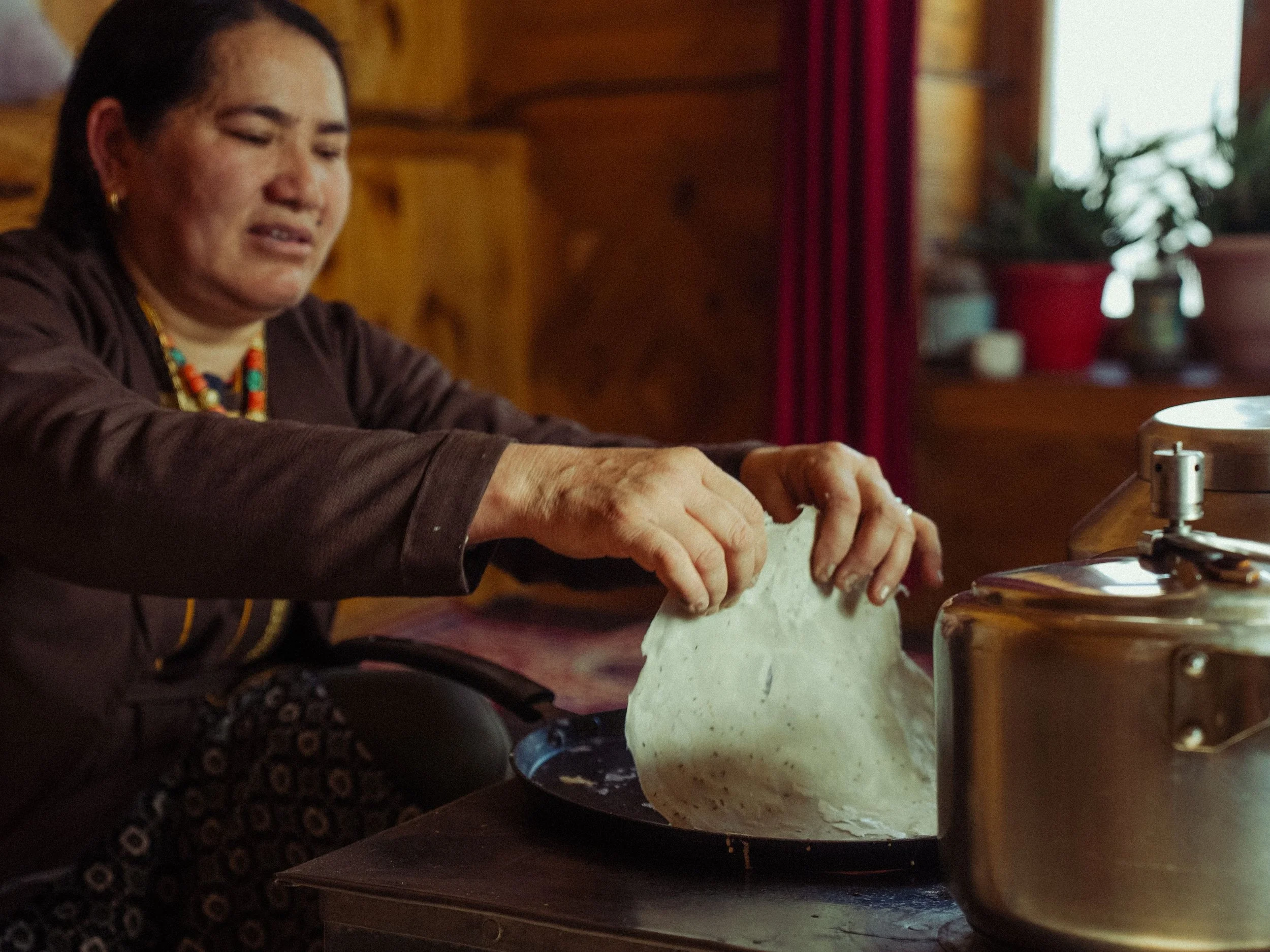 Shanti Devi runs a homestay in Lahaul. The smiling matriarch of the family As we thaw, the otherwise uninhibited yet initially awkward Shanti Devi begins the preparation for manna — a neer dosa-like crepe made solely with locally grown buckwheat and kala jeera found in the valley’s forest. This simple dish is enjoyed with ghee made from the milk of livestock reared by each household.