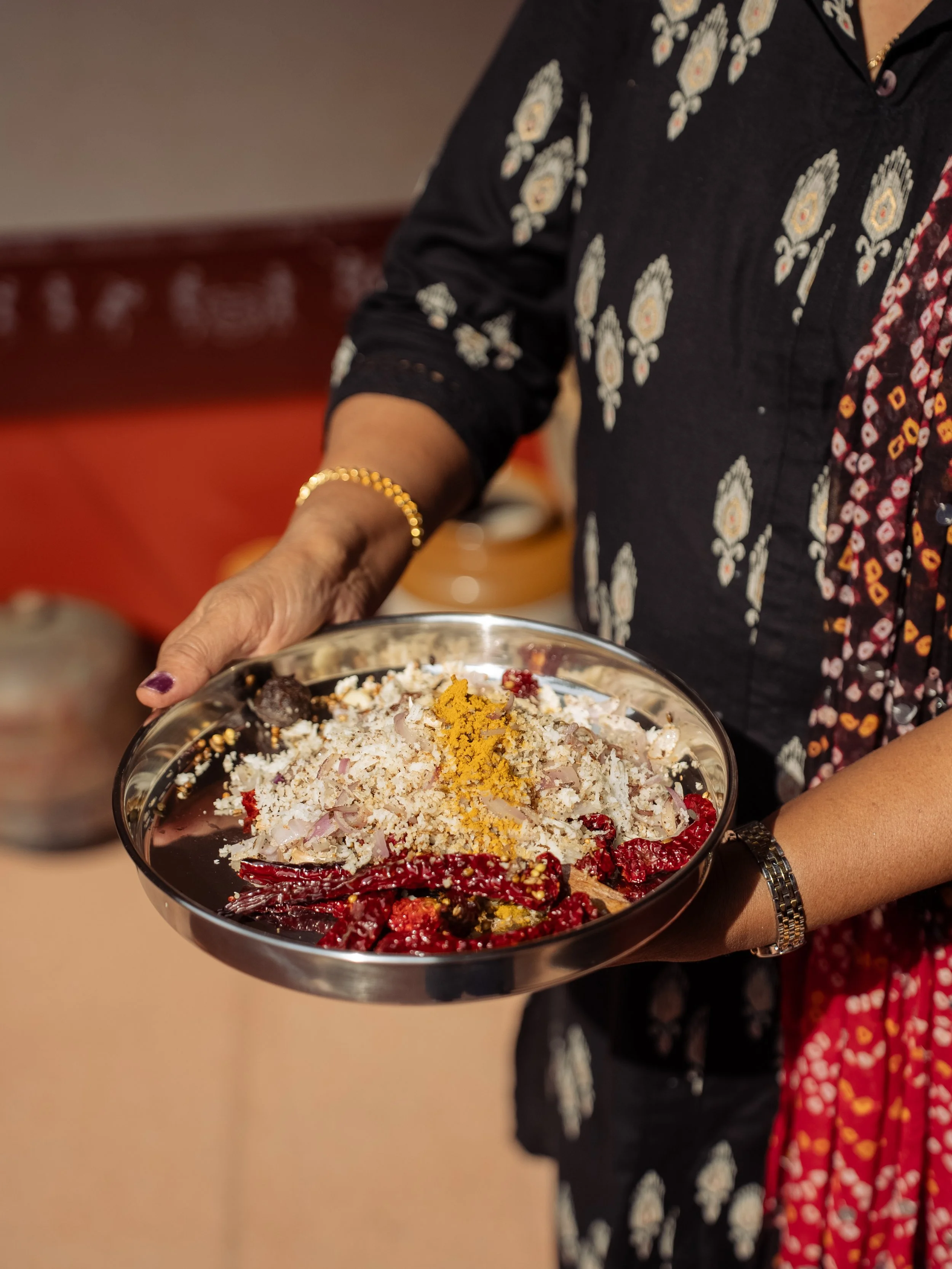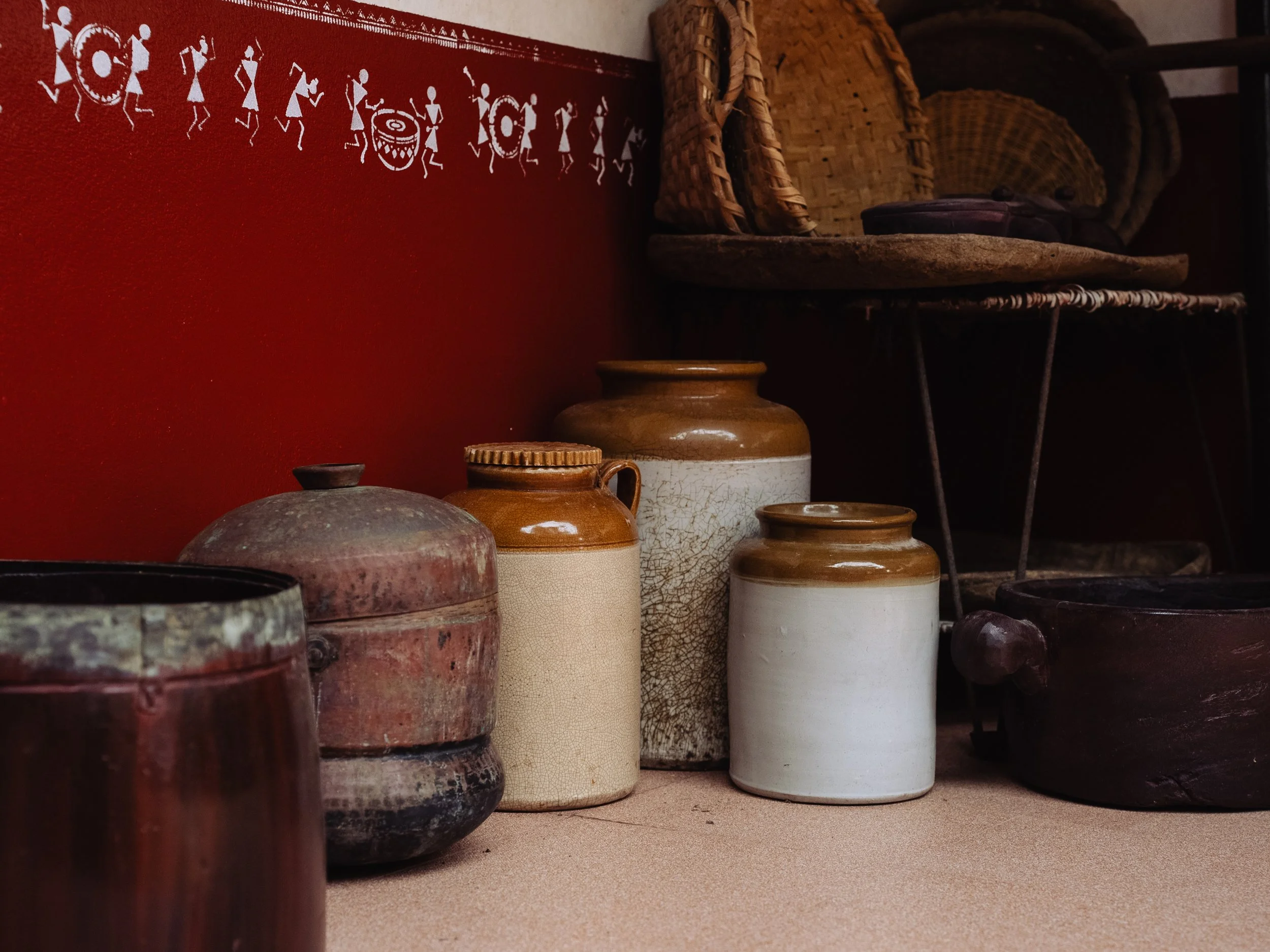 A burst of sunshine greets us as we step into her kitchen. For those of us from the west coast, it is not unlike stepping into our own grandmother’s kitchen — with red oxide floors, ceramic pickle jars arranged heightwise, small and big granite grinding stones lined up against a warli-painted wall, and wicker baskets stacked like Russian dolls.