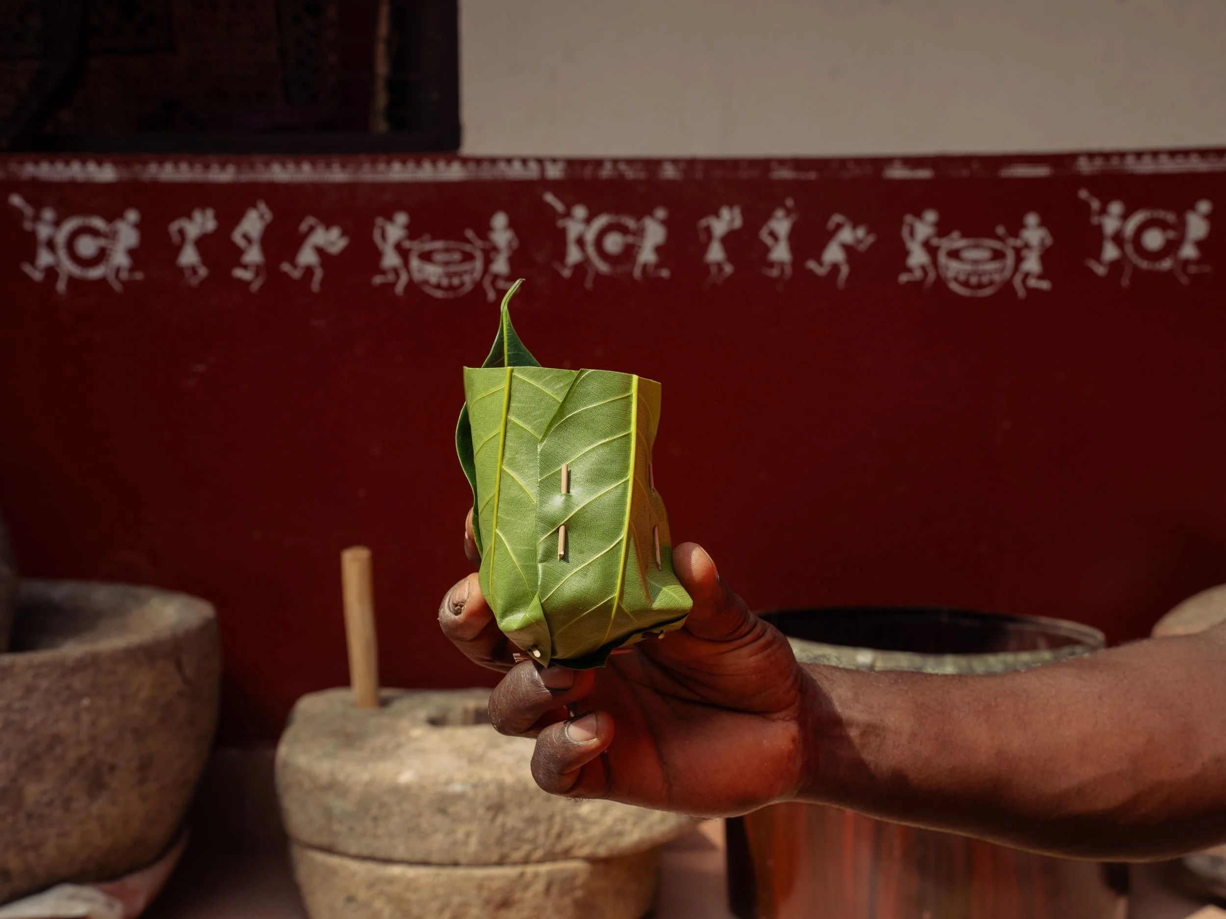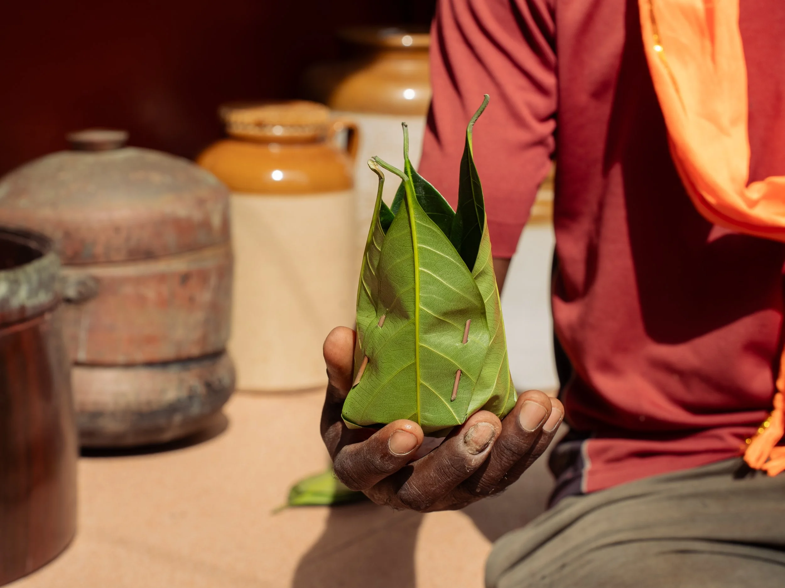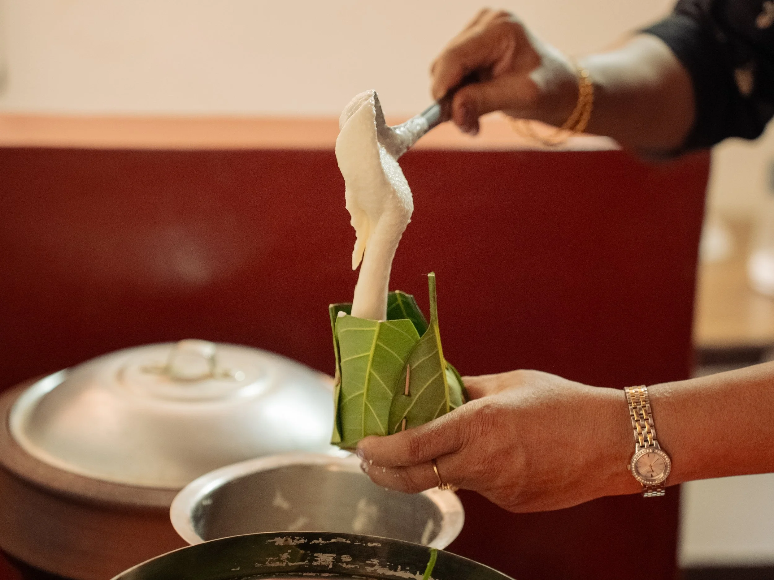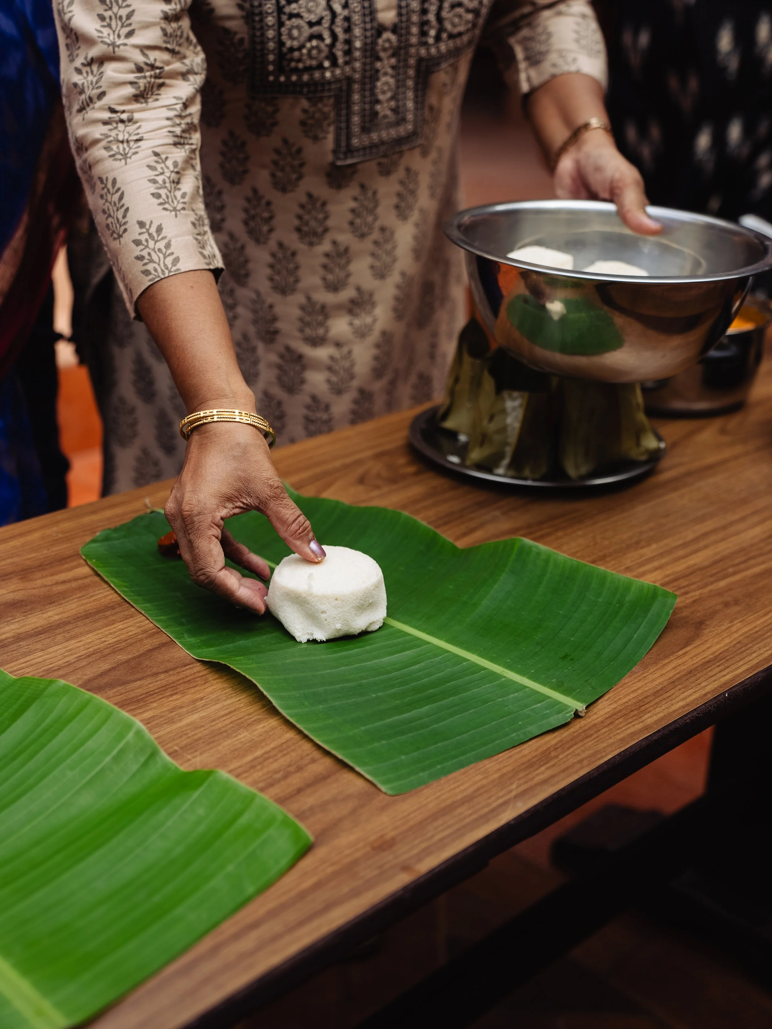 While she cooks, her domestic help Gopala, makes jackfruit leaf pockets for the kadubus. A set of four leaves are placed together like a square and gently folded at corners to make a pocket tower. These leaves are held together by tiny toothpick-like stems, and the top is cut on three sides to create an opening. One leaf is intentionally left whole, to make it easy to hold and pour the batter into it. It is an origami class with an Indian theme.