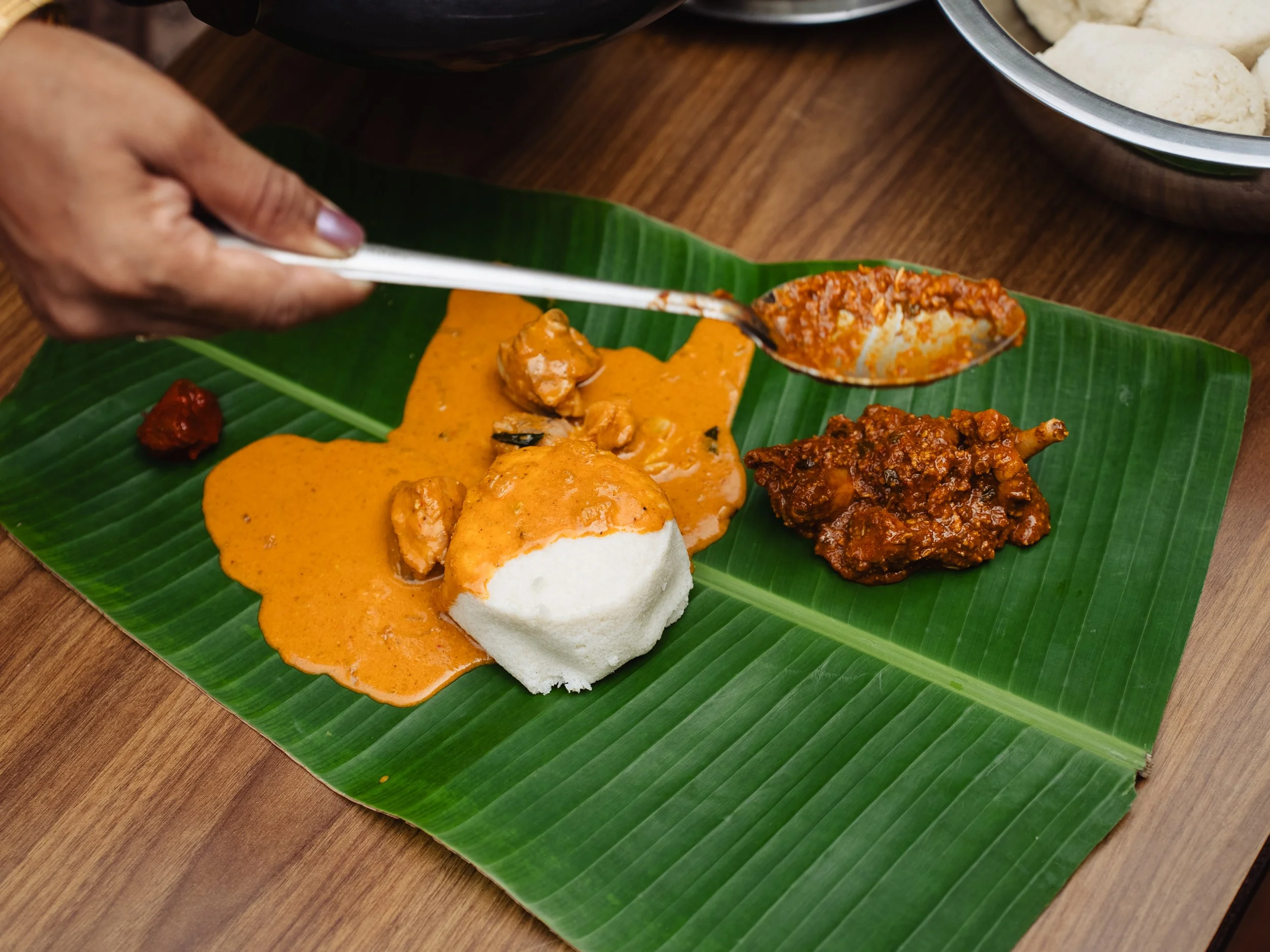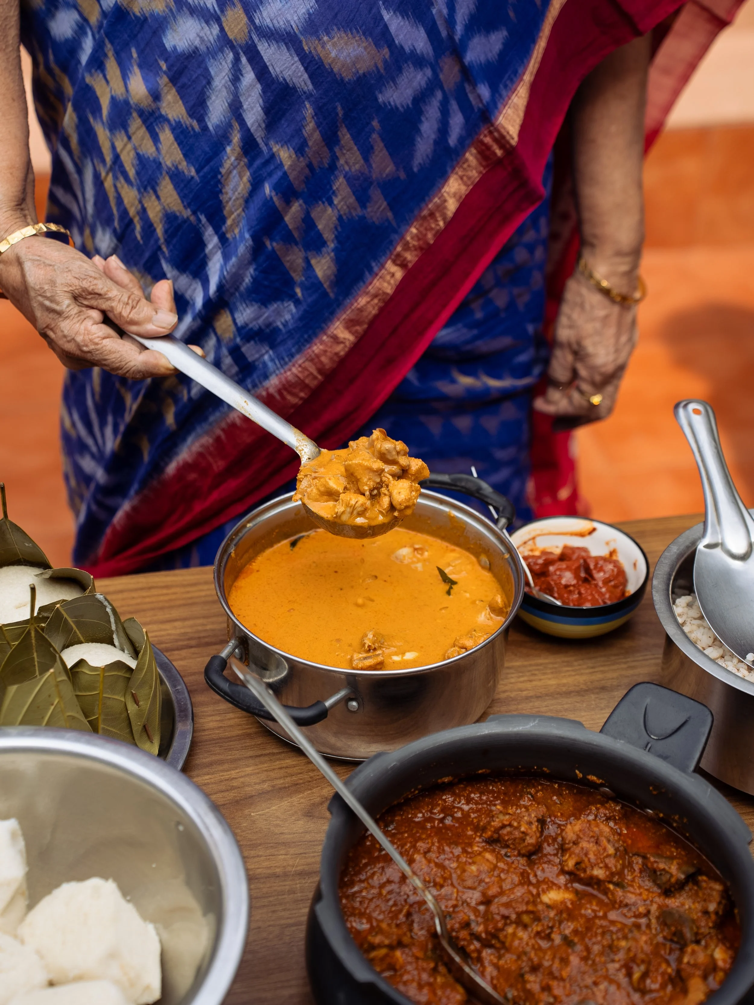 Geetha, her mother, and her sister move in rhythm as they serve, but hesitantly pause to see who goes first. This confusion causes a giggle roulette between them, followed by subtly checking out chicken pieces on each other’s plates (to see if someone got a bigger share). Everyone then gets busy, deeply focussed on the coconut chicken goodness in front of them.
