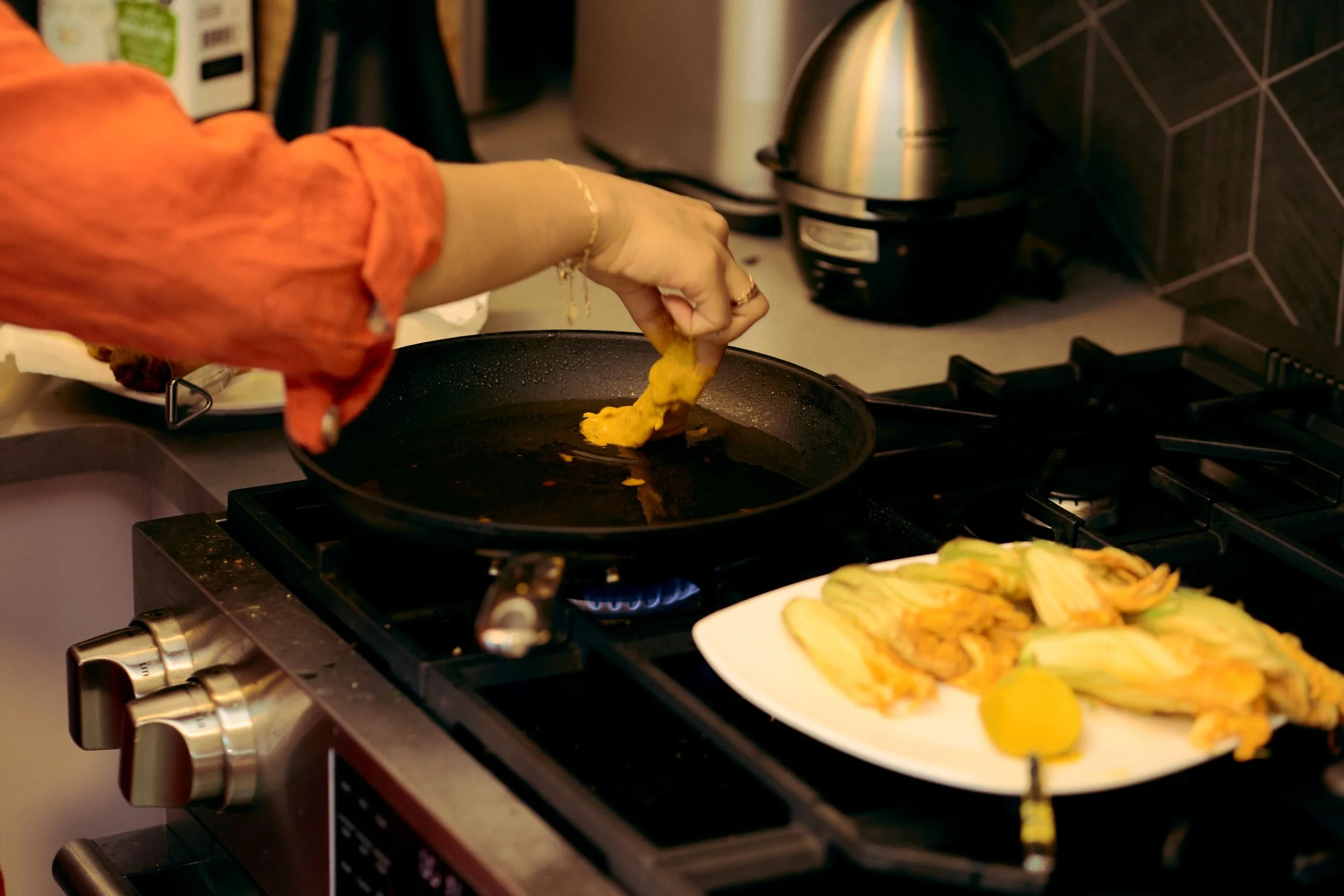 “If I see pumpkin flowers at a farmers’ market, I have to buy them,” she says. “It's instinctual. I’m drawn to them like a moth to a flame.”