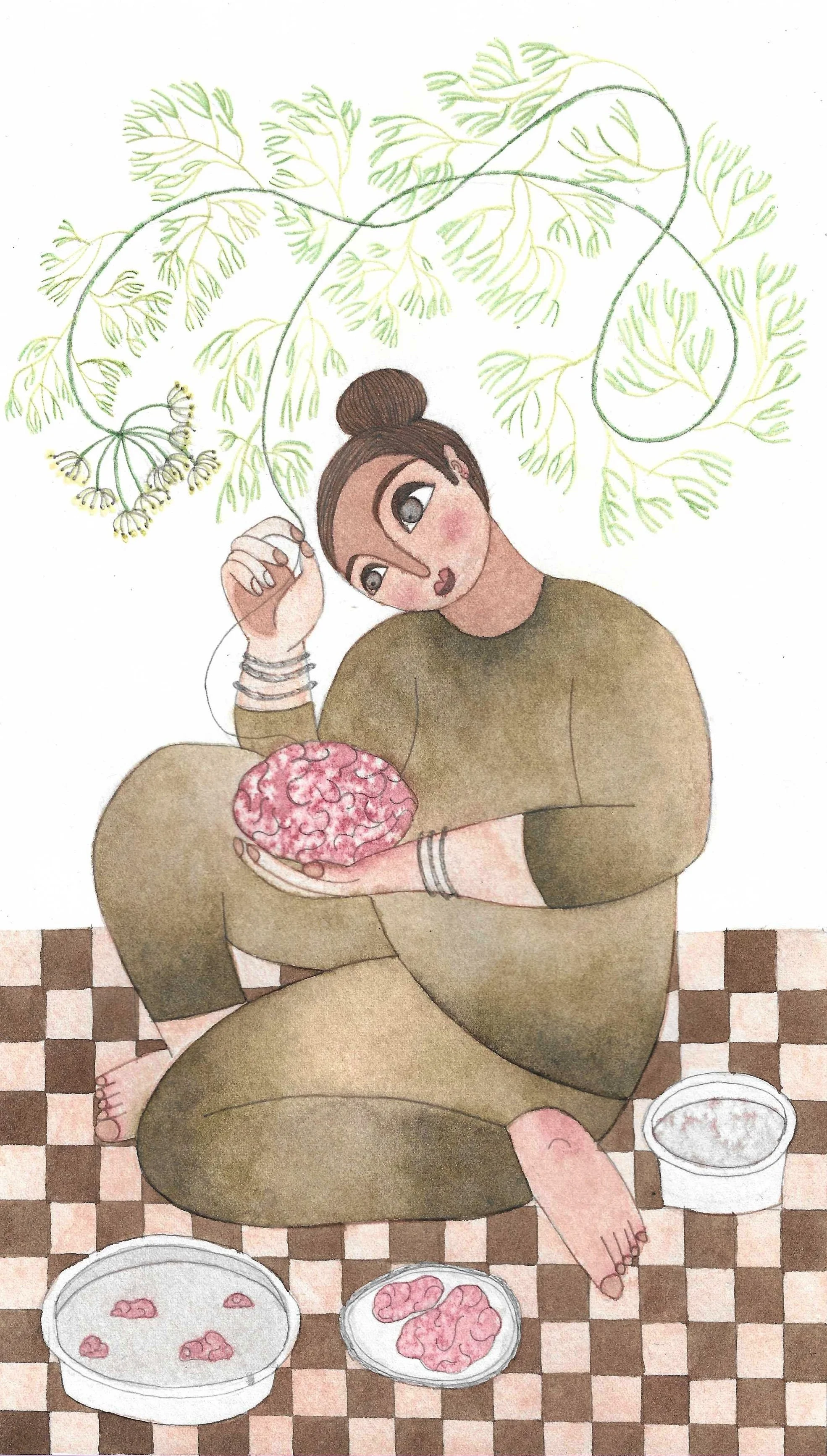This year, around noon, my mother [Farah Deeba] and I start preparations at home. I sit cross-legged on the floor, the pale and fragile goat brain resting in my palm, its folds like soft ripples on still water. The challenge is to keep the brain intact or ekjut, as my mother calls it. Fine red threaded capillaries of blood cling on stubbornly. The work demands stillness, and yet a thousand thoughts race through my mind. I have eaten bheja several times, and love it, yet this is the first time I am handling, and attempting to cook it with my mother.