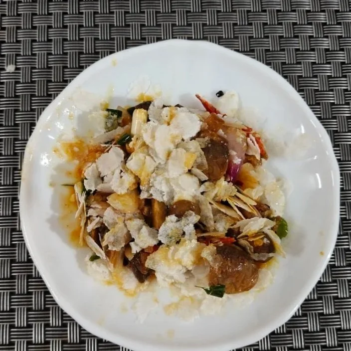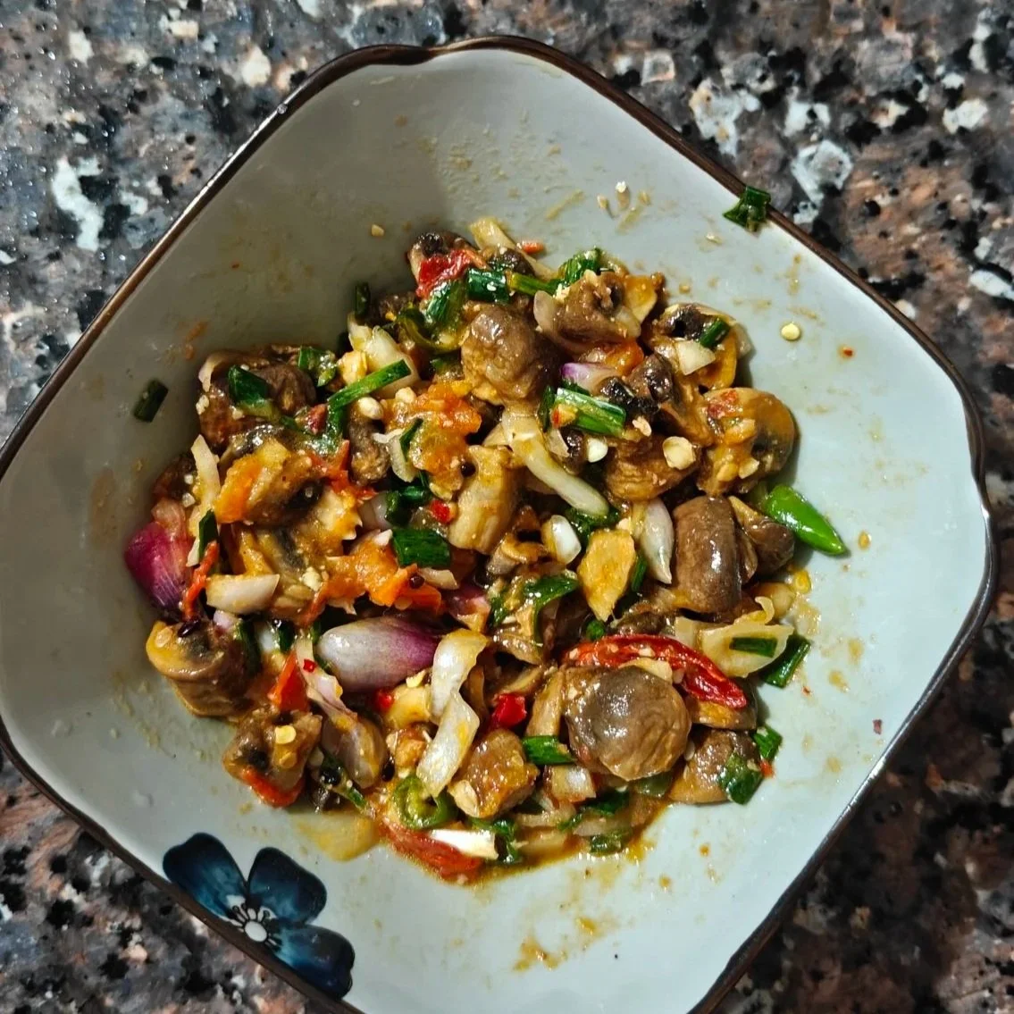 I followed Kabita’s advice during the recreation, adding stalks of home-grown garlic for a burst of garden-freshness. I opted for a dry, spice-rubbed preparation where the mushrooms were thickly coated in a fiery, aromatic marinade rather than a heavy sauce. To balance this concentrated heat, I paired the dish with beaten rice. The mild, almost neutral flavour of the rice effectively cut through the intense spice, while its distinct crunch provided a satisfying textural contrast to the tender, earthy mushrooms.