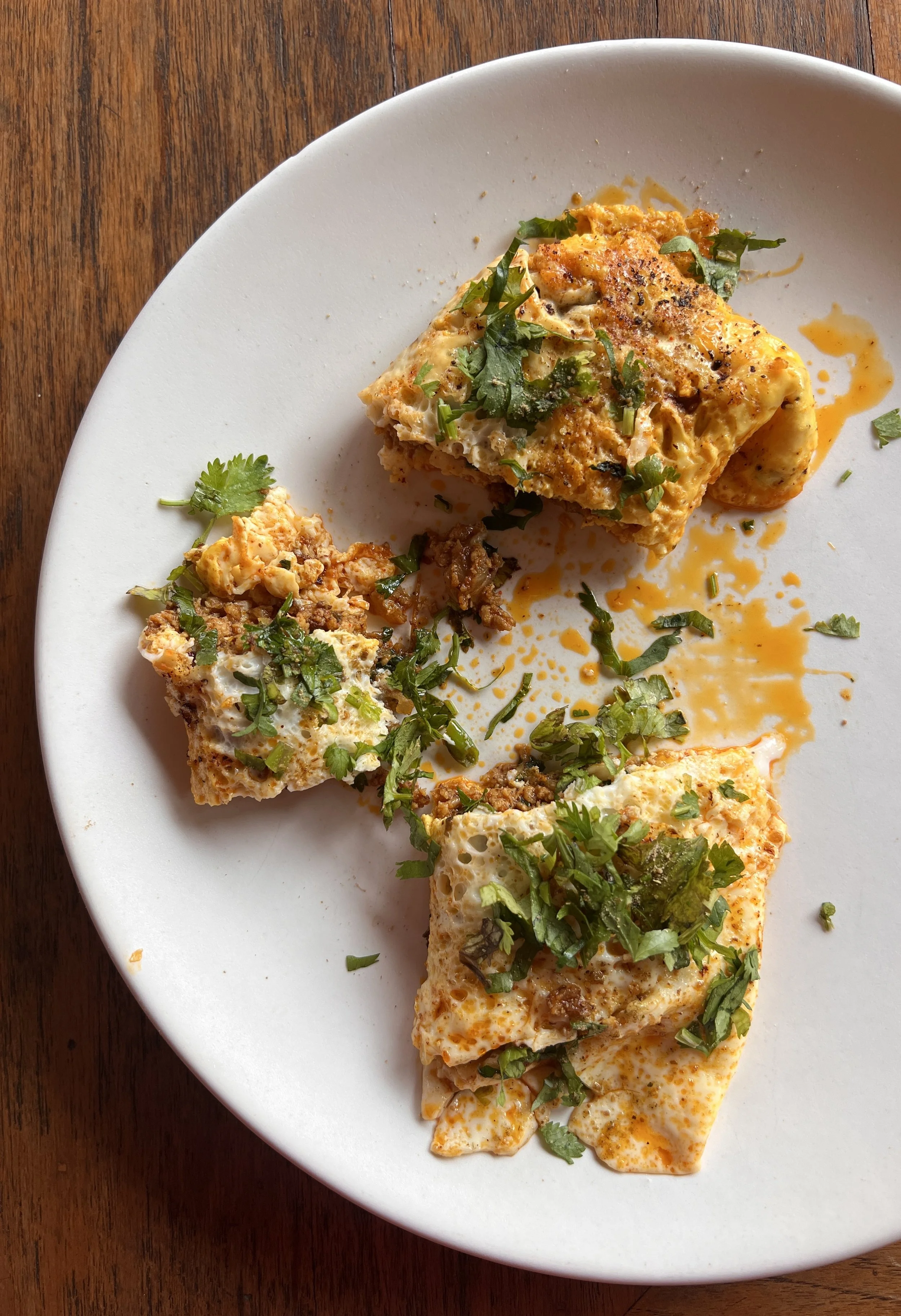 Crack two eggs directly onto a hot tawa, turn the heat down to low