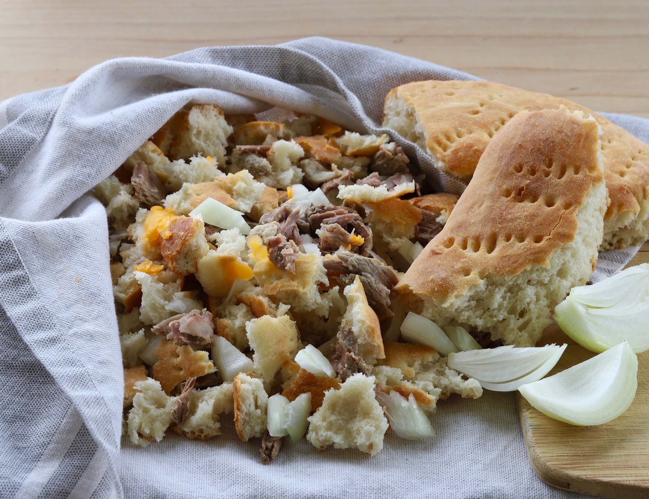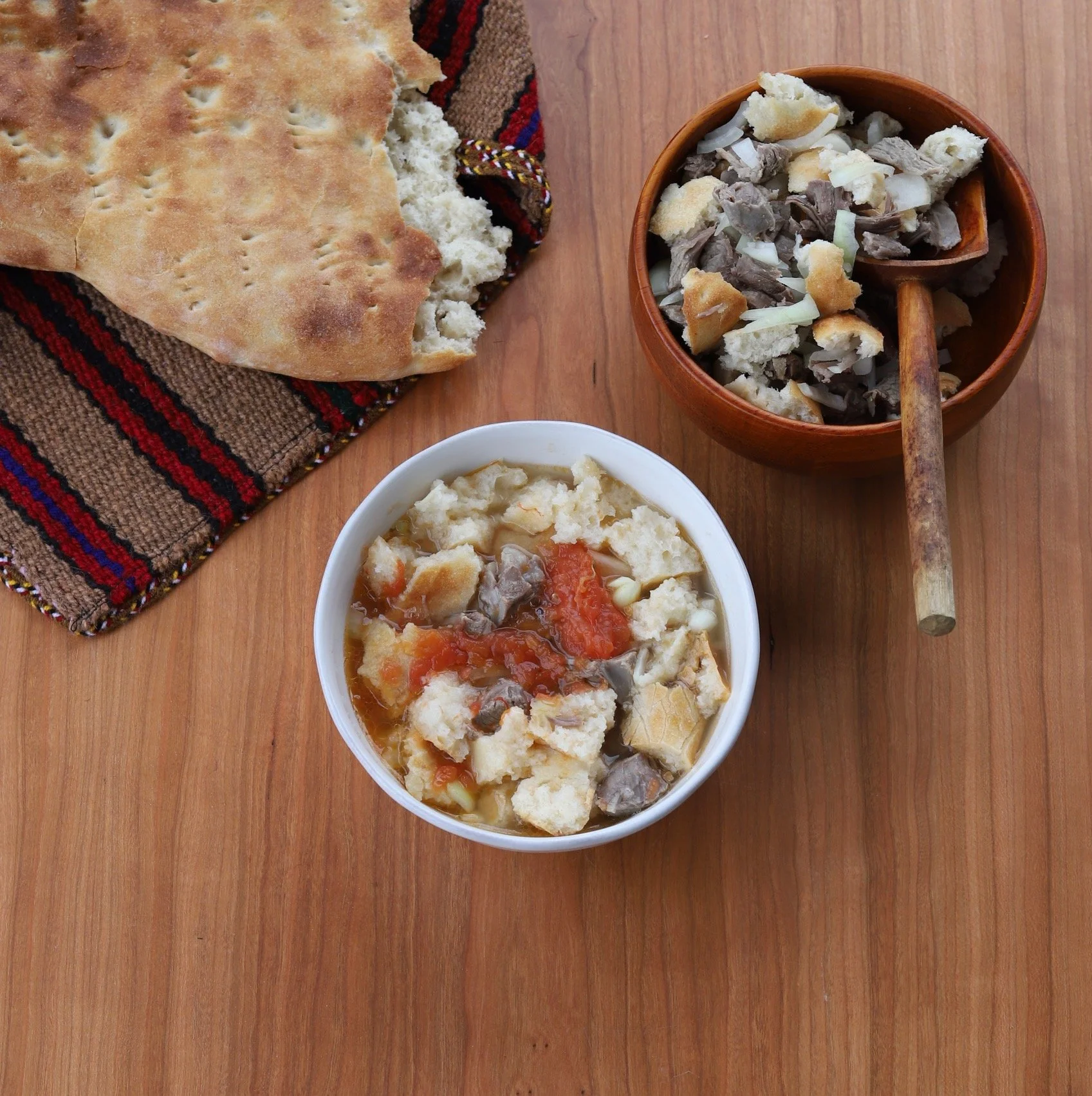 The men cut the cooked meat, dice fresh onions, and mix everything with the crumbled bread, kneading it by hand so the flavors infuse. When guests arrive, we scoop the mixture into hand-painted ceramic bowls, pour the steaming broth over it, and serve it with wooden spoons and a sprinkle of fresh black pepper.
