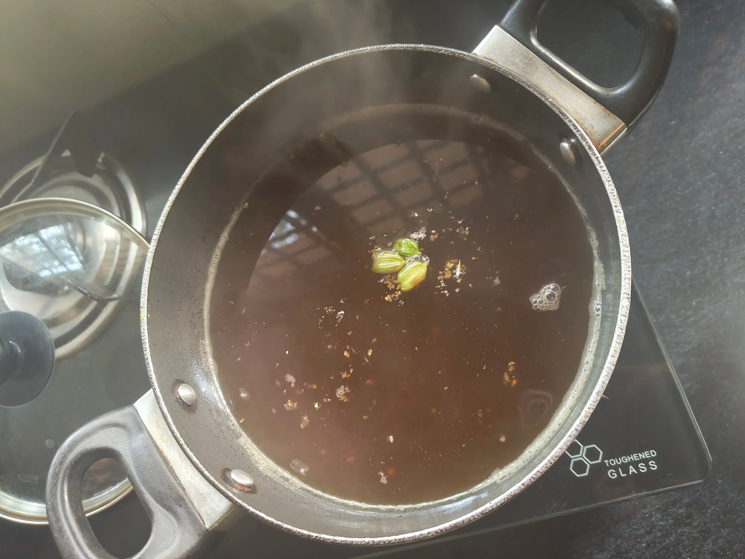 Add 3-5 cardamom pods split from the front, or use cardamom powder as per your taste, to the mixture and turn the flame off. The syrup should be one-string consistency.