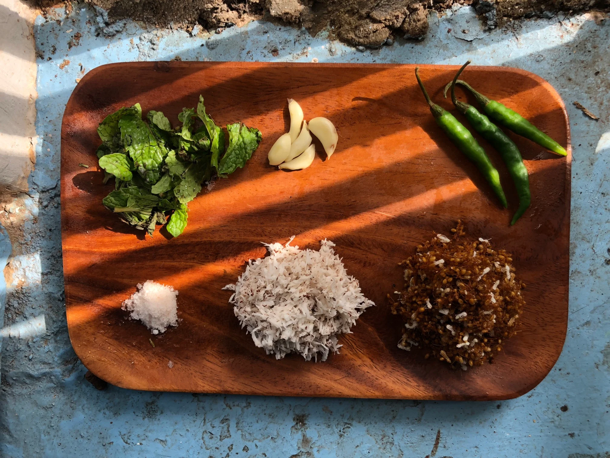 Our first iteration was a simple ant chutney — we wanted the ant to be the star of the show. Neha fit a mortar between her feet, and gracefully ground the ants into a fine paste. I grated a coconut as Vahishta went into the garden to pick out chillies and greens. Peter in the meanwhile, gently fried some ants until they turned a deep amber. How many different ways would this ingredient lend itself? Could it be used in place of lemon to make chilled ant tea? Would it allow us to replace gongura in a mutton curry? Would it be too much to fry the ants and use them as a base for the chutney itself? We had collected enough ants to last us months — variations were a necessity.
