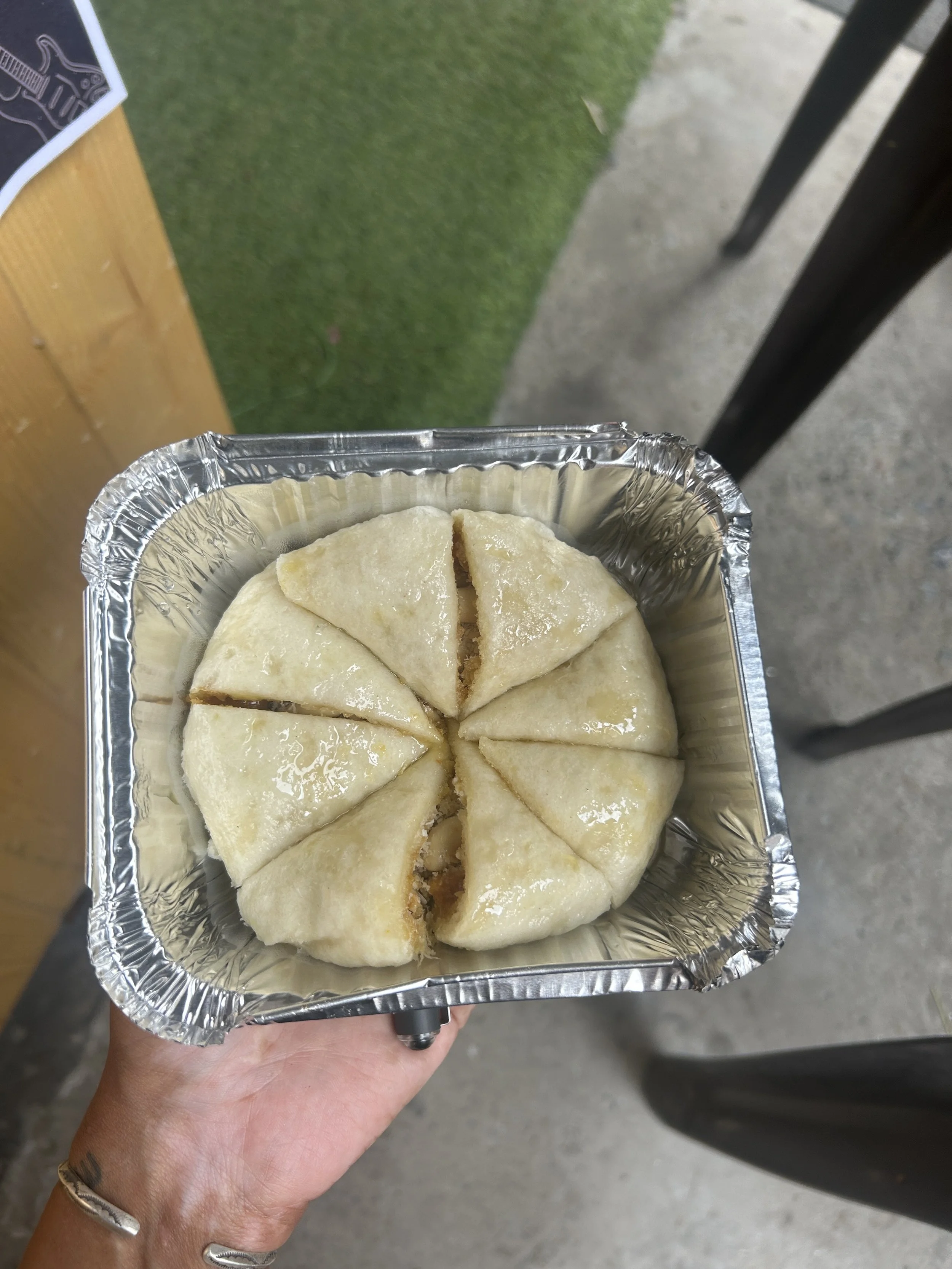 Roll the dough into a large flat circle, slather it with the mixture and then fold into a half moon.