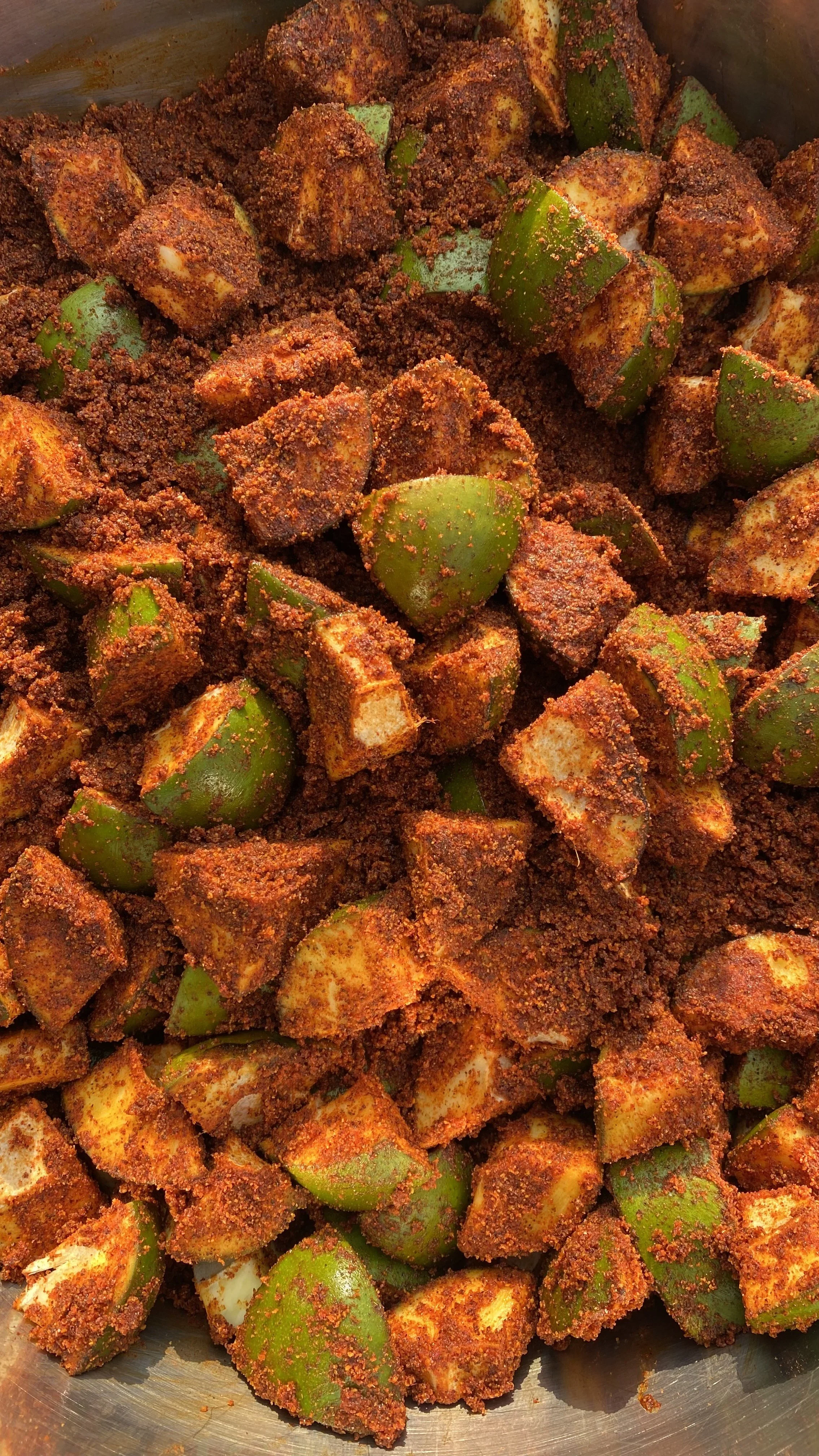 Baamma, my paternal grandmother, would be in the kitchen, elbow-deep in avakai (pickle) — it looked almost like a witch’s cauldron to us. As she mixed kilos of pickle with her bare hands, my aunt would add in mounds of salt and endless glugs of silky oil into the tub. My cousins and I would slink in and out of the kitchen, waiting to get a taste of fresh, fiery pickle. We weren’t allowed to do much else, and we always managed to sneak a few pieces of mango, hoping to escape unnoticed. I, however, always managed shoplifting a few extra pieces because I would carry the giant plates of mangoes up to the terrace - the family’s baahubali.