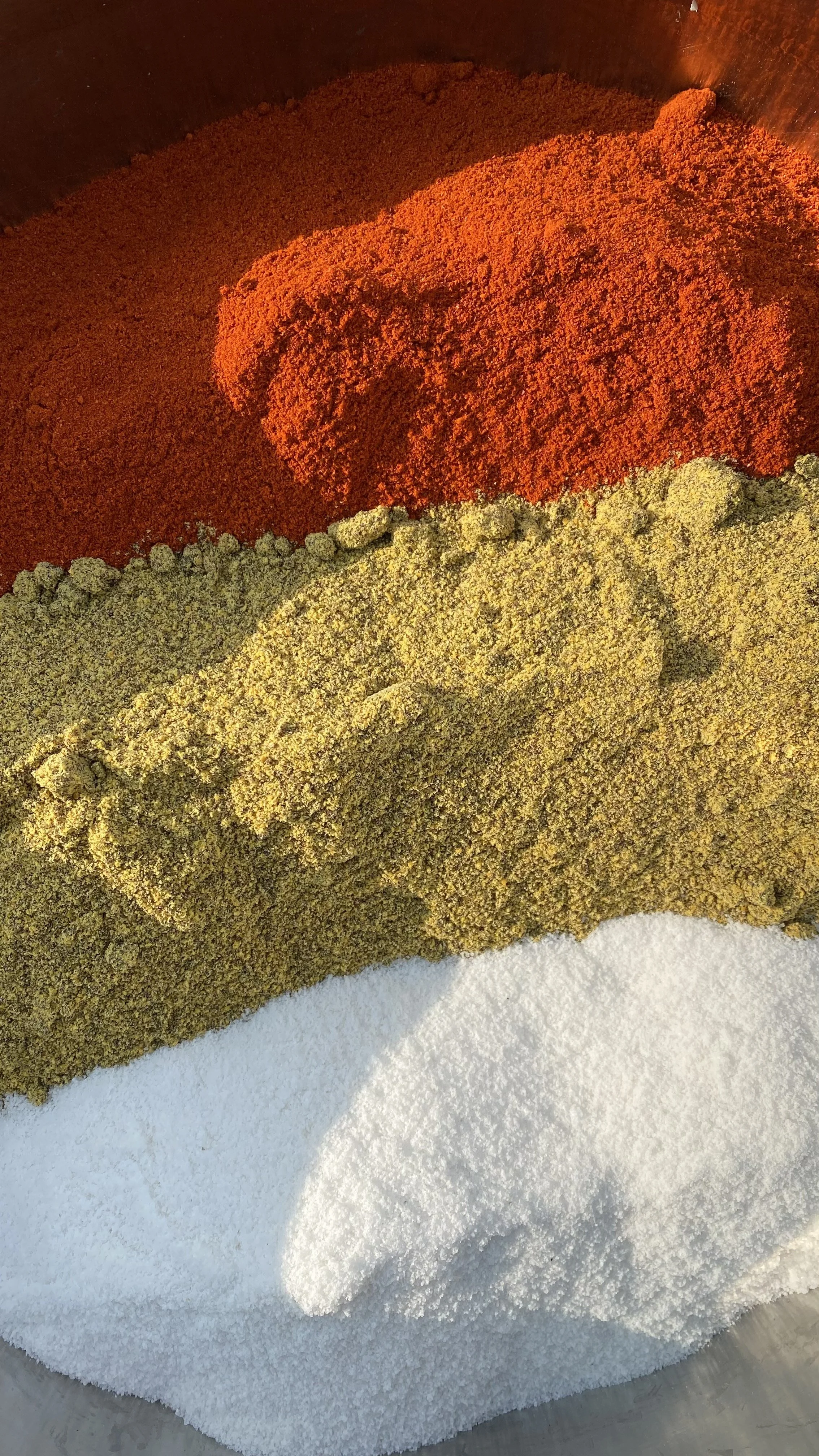 In a separate bowl, mix the chilli powder, salt, mustard powder and turmeric.