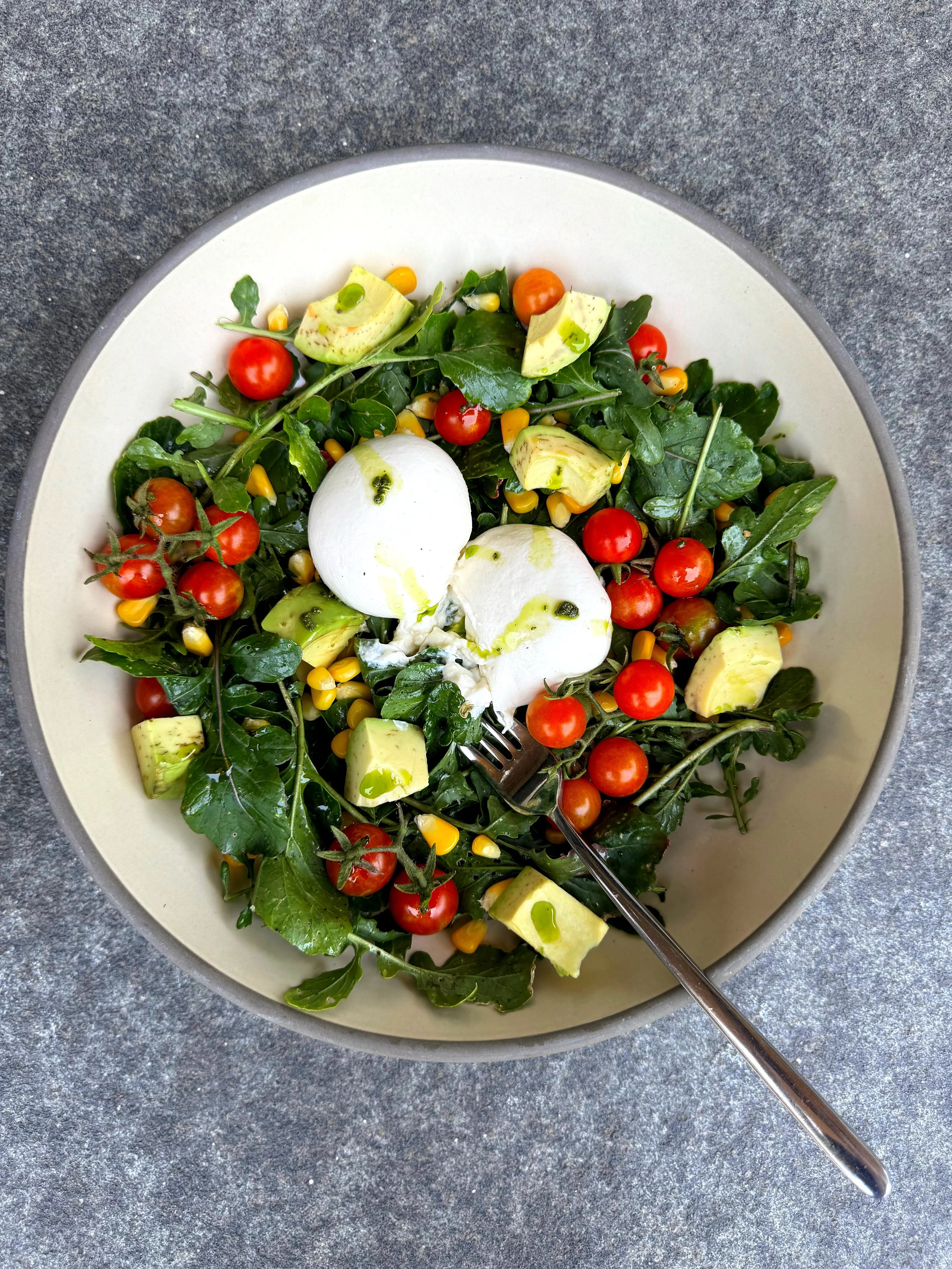 It began quietly, in a sunlit corner of my kitchen, surrounded by vegetables that still carried the faint scent of soil and summer. Arugula with tender edges, corn fresh off the cob, cherry tomatoes still warm from the garden. I wasn’t cooking for anyone in particular — no dinner party, no shoot — just a pause in the middle of a busy week, and a feeling.