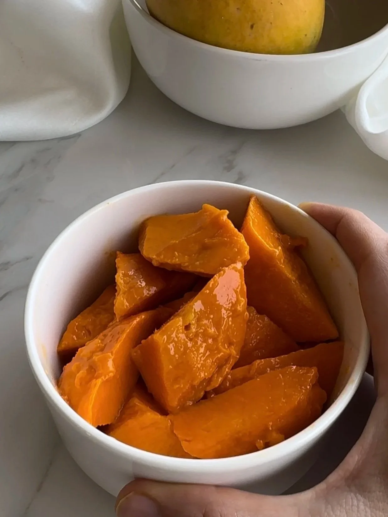 Before: Rough mango chunks carelessly tossed into a bowl.