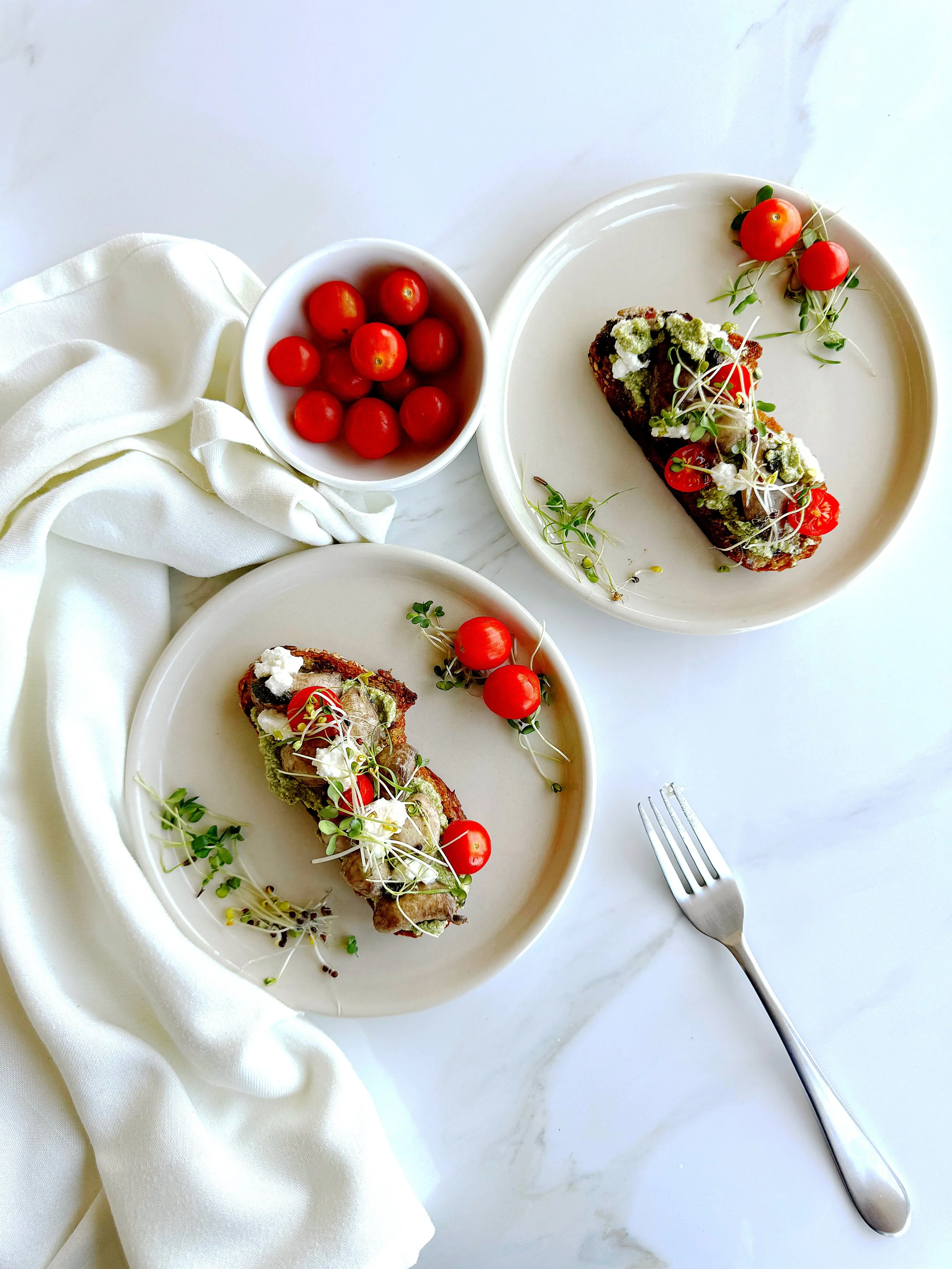 After: Two avocado toasts artfully arranged on minimalist plates, accompanied by roasted cherry tomatoes and delicate microgreens.