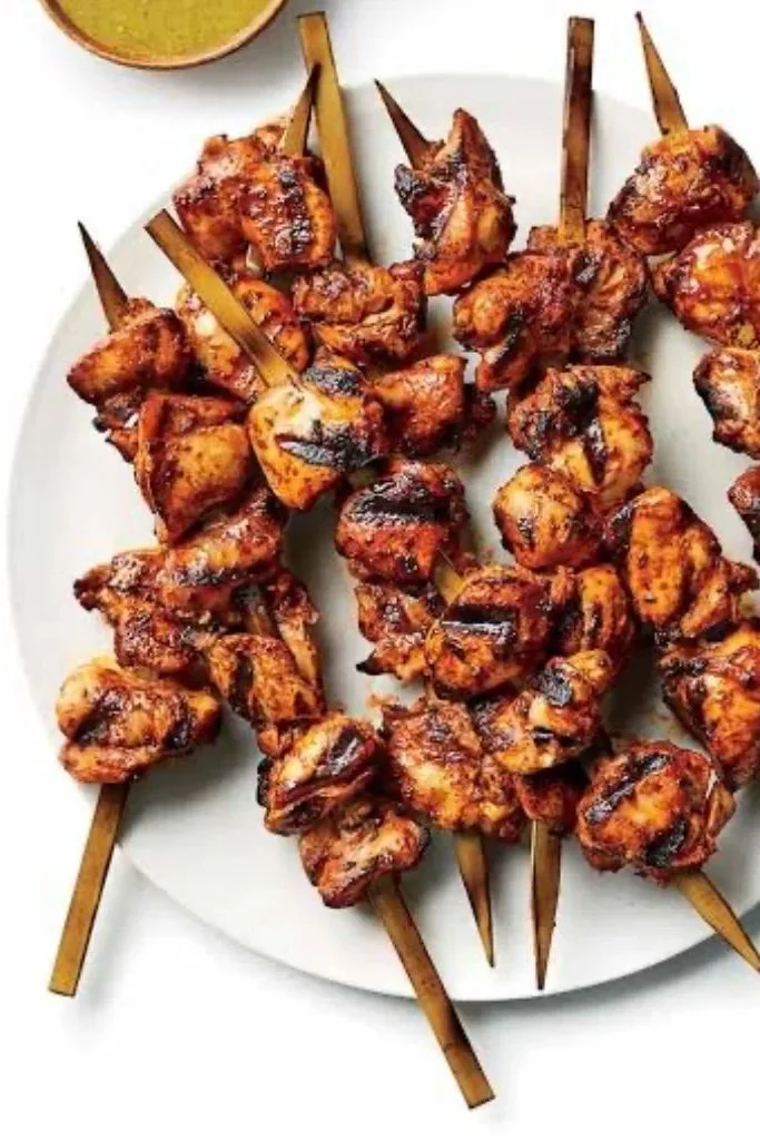 Before: Chicken skewers stacked on a plate appear rather uninspiring and lack visual appeal