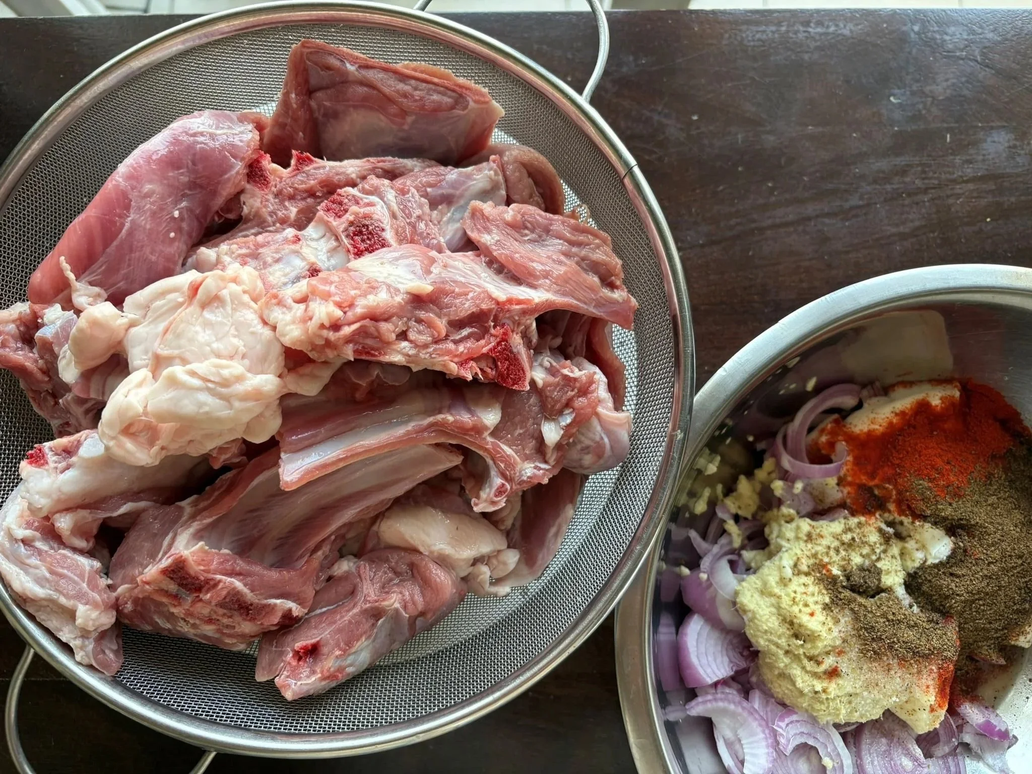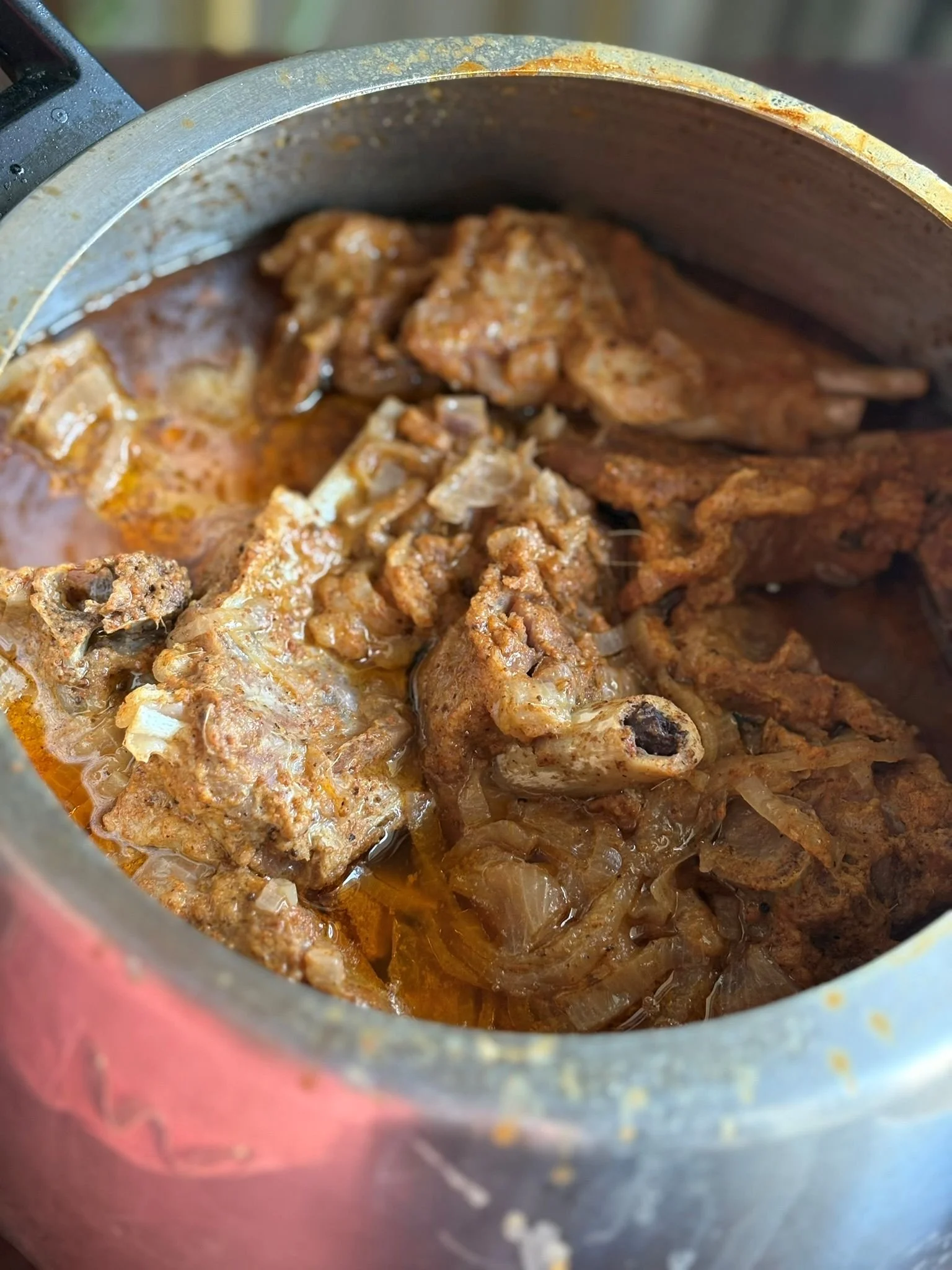 2 kg of mutton cut into large chunks — ribs (champ) and short ribs (seena), shoulder (dasti) could be added