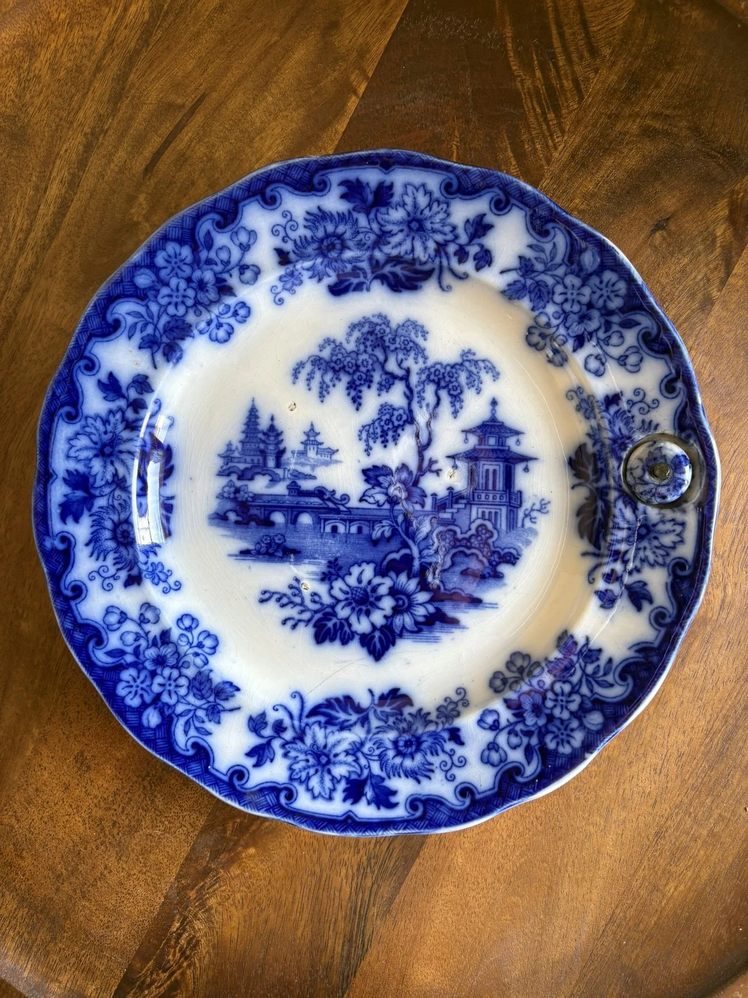 Grail must be had warm, or its fat tends to solidify. To solve this problem, it used to be served on a double walled plate that is designed to keep warm. This was achieved by pouring warm water down the opening on the side, which was then plugged with the ceramic topped cork stopper. We inherited one of these blue coloured plates, and it is over a hundred years old — a prized possession, just like grail.