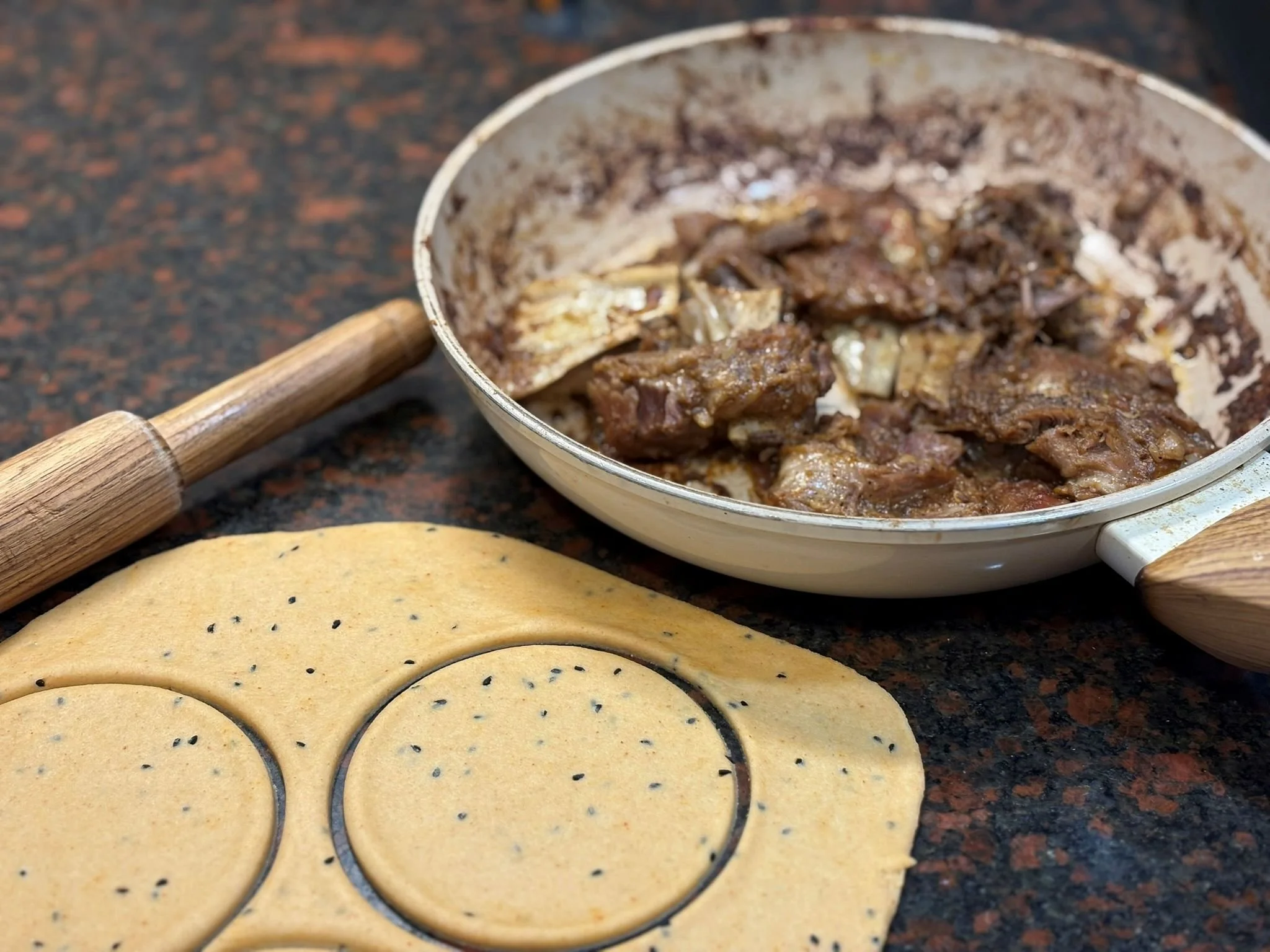 We have always had grail with roti, till I discovered that it is traditionally served with something called namkeen tikiya which is a thick poori made with atta, kalonji, red chilli powder, a bit of oil and salt. Occasionally some spicy Bihari aam ka achar ka masala would be added to it. The dough is rolled out to about double the thickness of that of a poori and palm sized rounds are cut out. The tikiya is then deep fried on medium heat so that it cooks through. There is also a version where instead of oil, melted goat fat is added to it, making it extra flaky – or khasta.