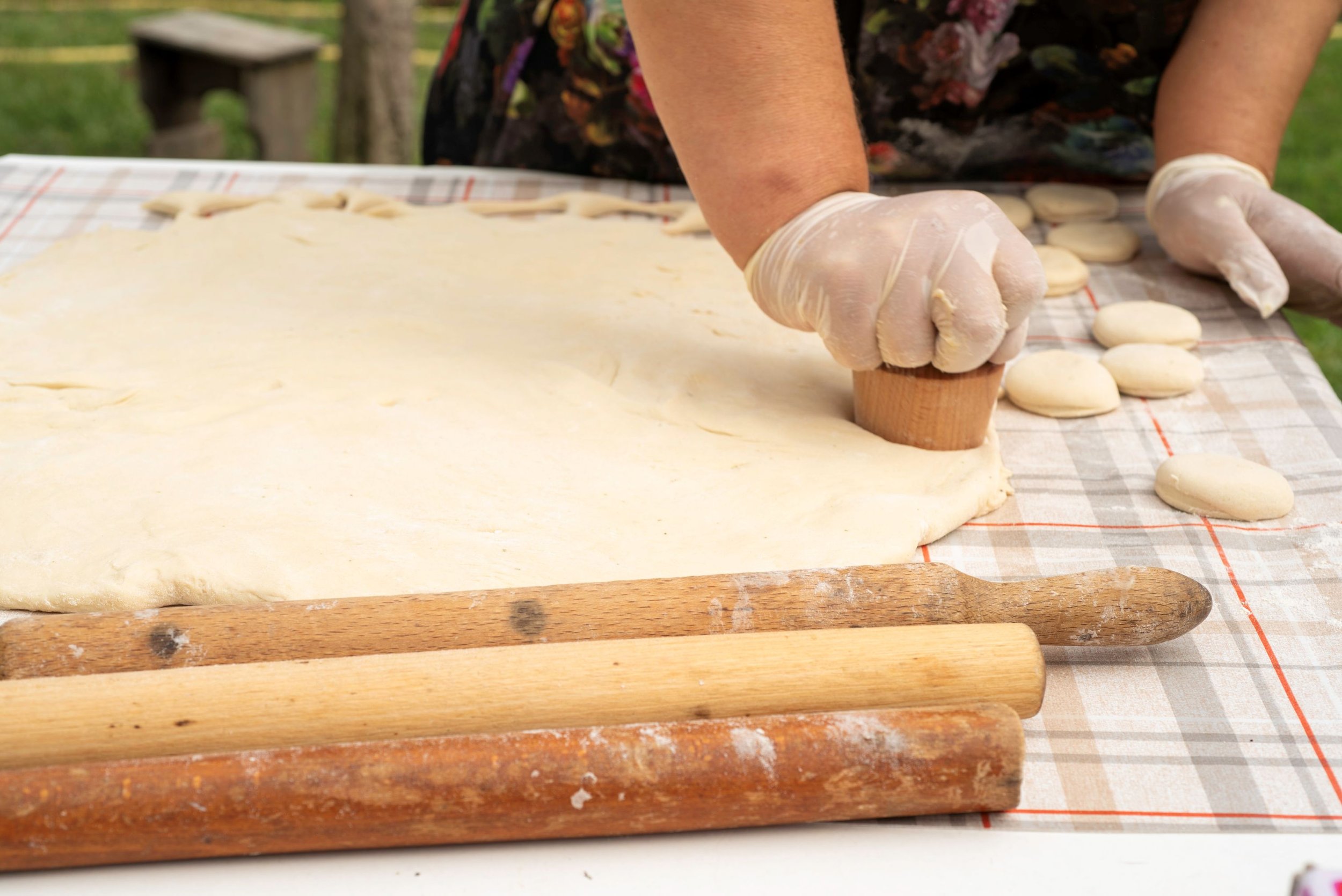 Cut circles using a 7 cm cutter or a glass. Traditionally, a wooden cutter resembling a large egg cup is used. Gather scraps, knead, roll and cut again until all the dough is used.