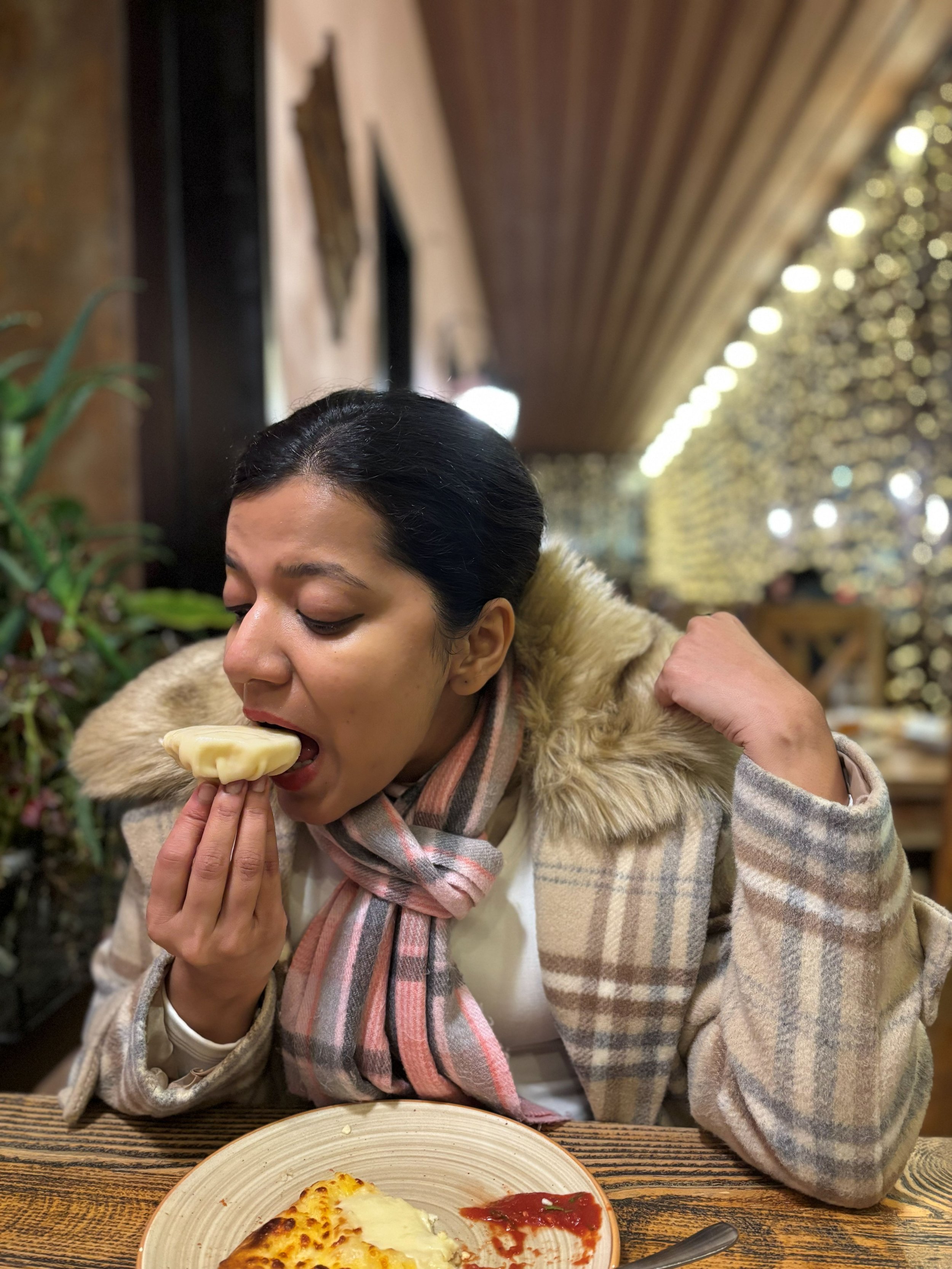 The author demonstrating the right way to eat khinkali. Credit: Henna Shah