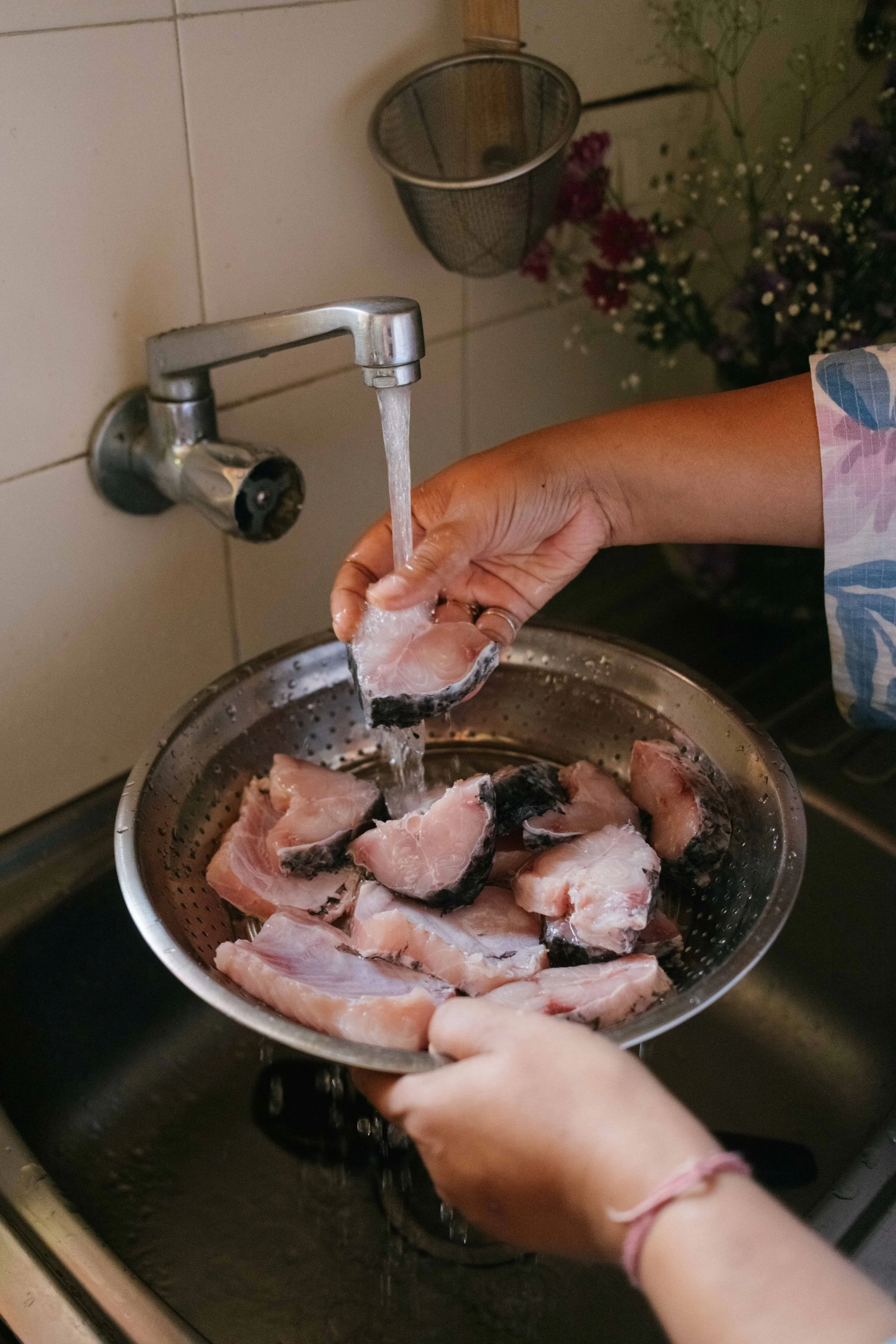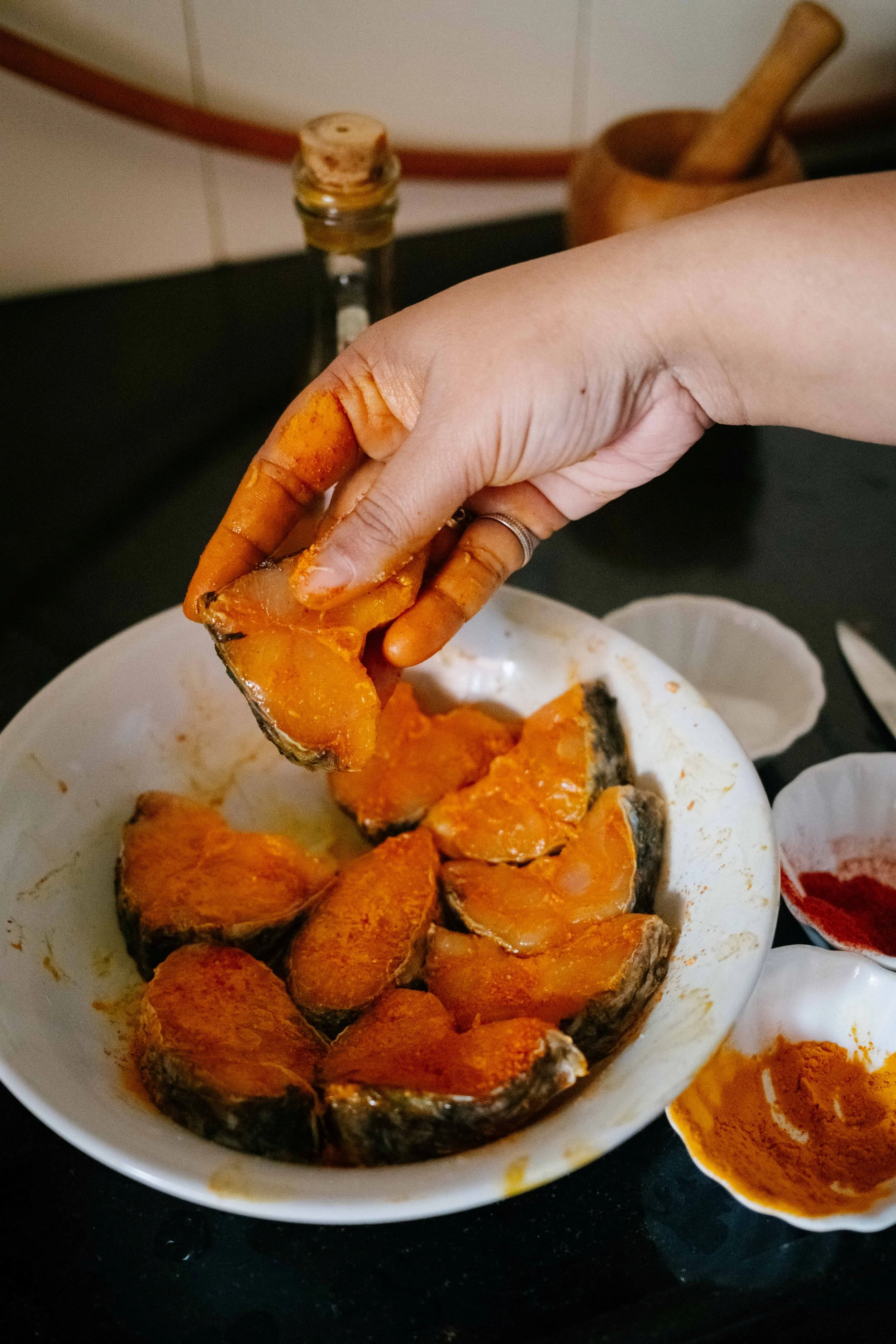 Wash the fish and marinate with a pinch of chilli powder, salt and turmeric.