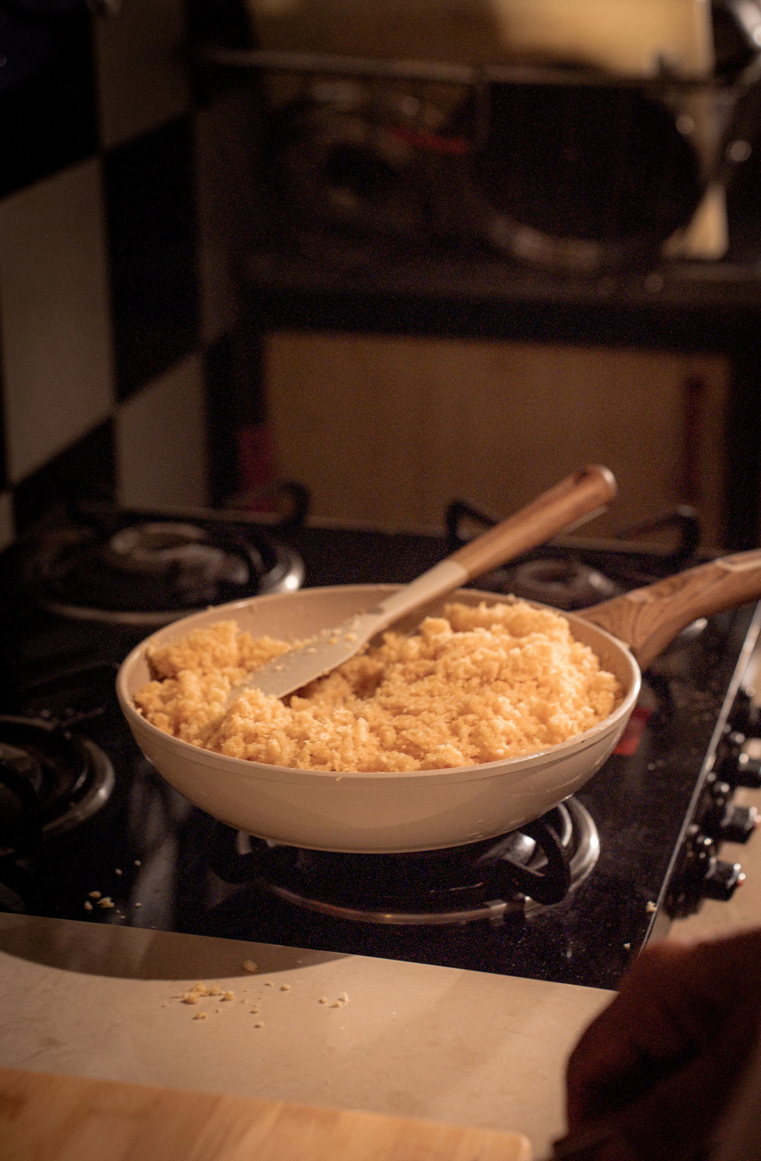 Cook on medium heat, stirring continuously, until the mixture looks about 70% dry and comes together.