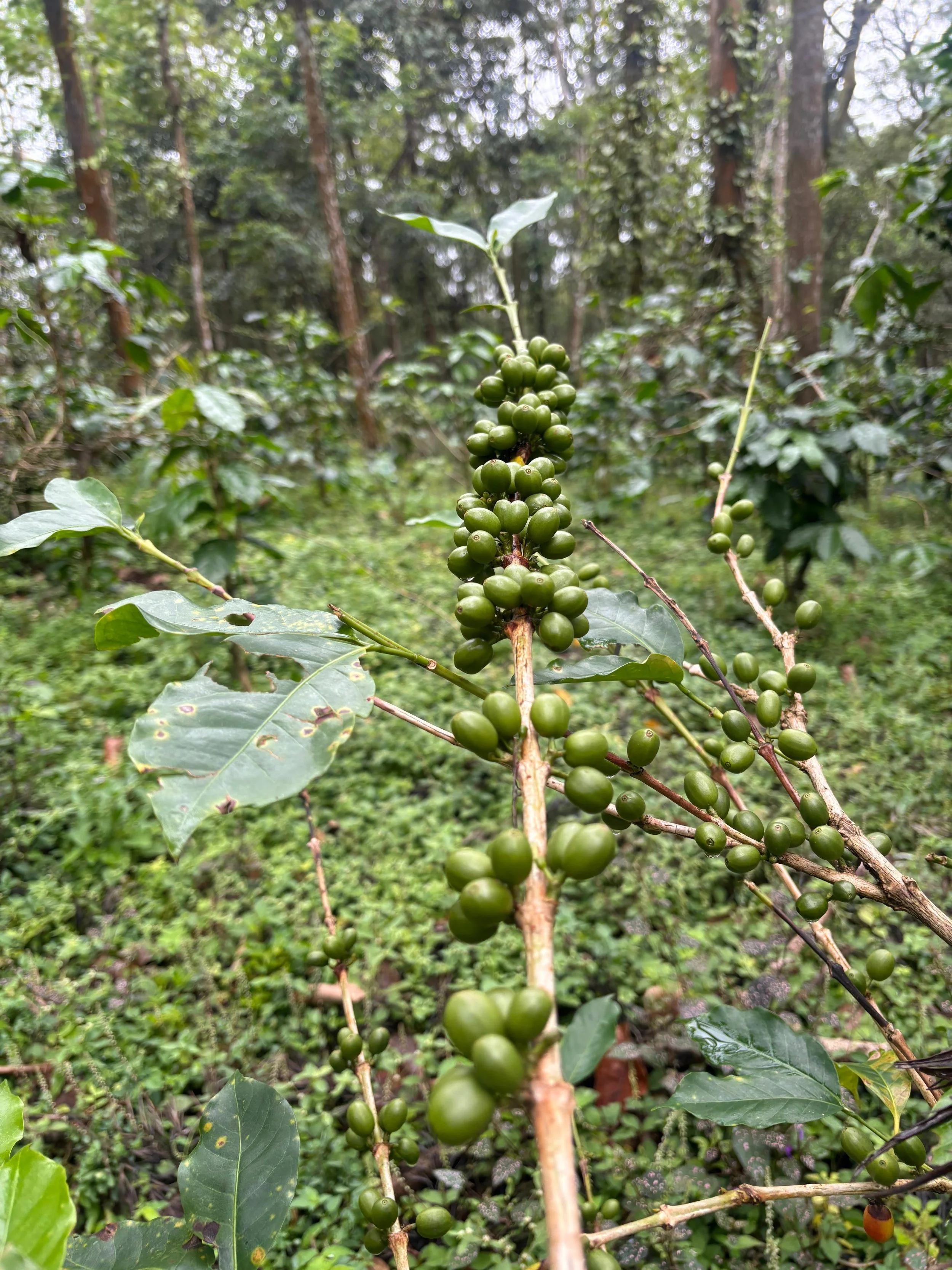 A whole row of Coffee Arabica plants, that have dealt with this excessive monsoon by choosing to shed all leaves, and try to focus on reproduction instead, with all the unripe fruits still attached on its branches.
